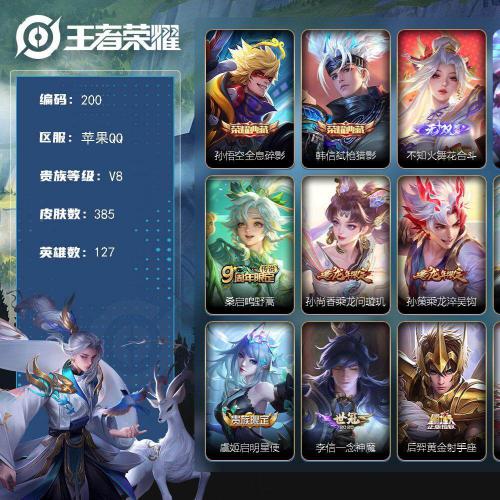 【V8 非凡王者 英雄数量:127 皮肤数量:385 荣耀典藏:2个 无双至尊:1个 珍品传说:1个 星传说:2个 传说皮肤:14个 稀有限定:20个 皮肤价值:287520】W10124,,,可立即换绑无需挂单养号,铭文满级,,,典藏2,,,传说14,,,星传说2,,,按键7,,,夺宝219,,苹果Q-V8-Z强王者段位-127英雄-385皮肤-2典藏